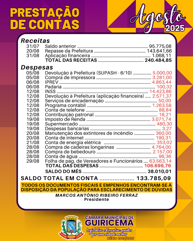 Marcos Antônio Ribeiro Ferraz Presidente | Marinaldo Alves Vice-Presidente | Luimar De Battisti Júnior Secretário |